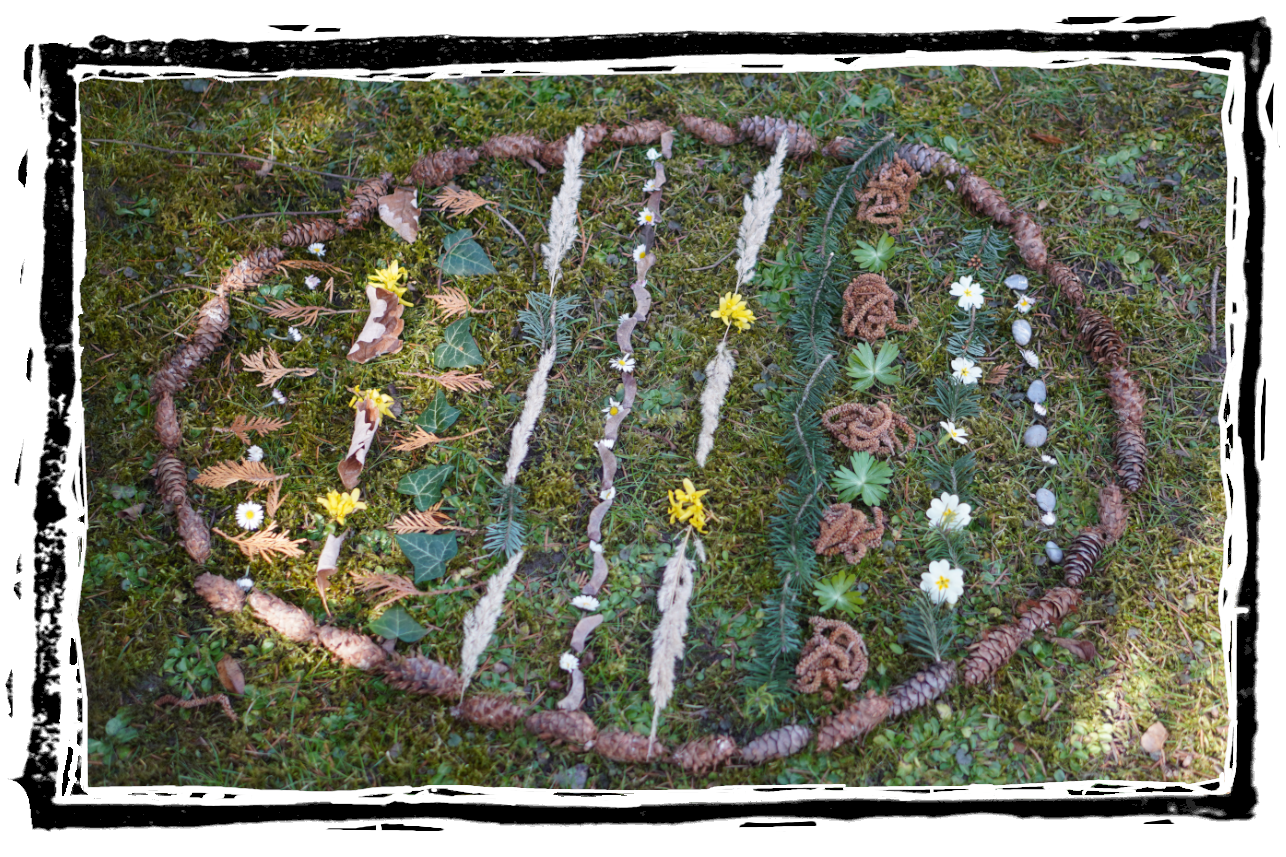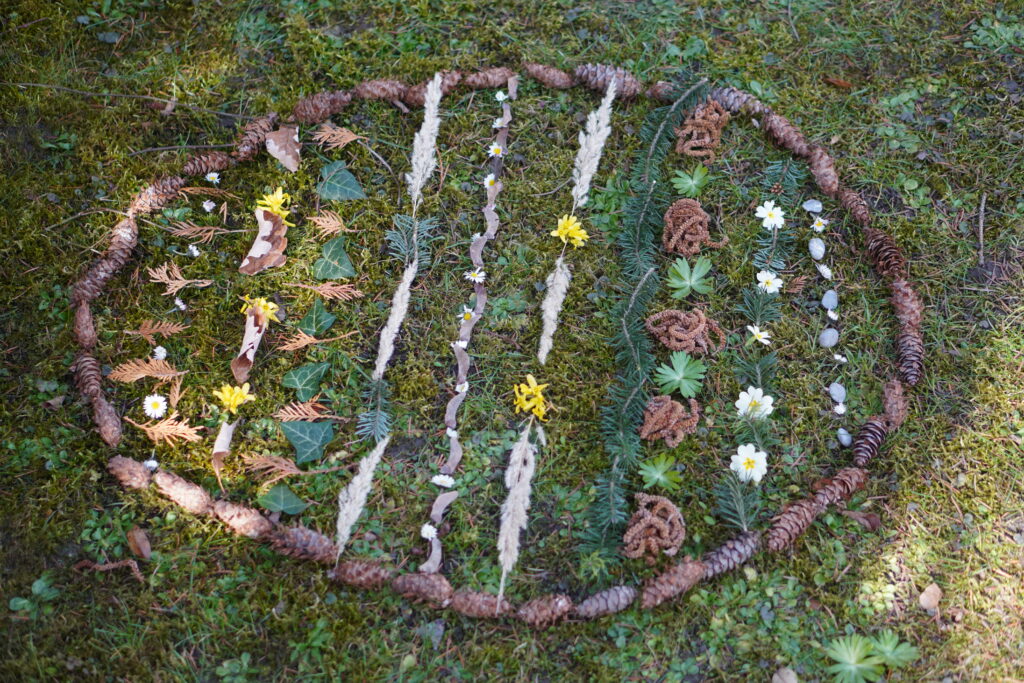 Barna deles inn i to grupper. Hver gruppe lager omrisset av et egg og skal deretter “dekorere” det sammen: Hver elev får ansvar for én rad: De finner på et mønster av naturmaterialer, for eksempel å veksle mellom en kongle og en stein. De legger dette mønsteret i starten av raden.