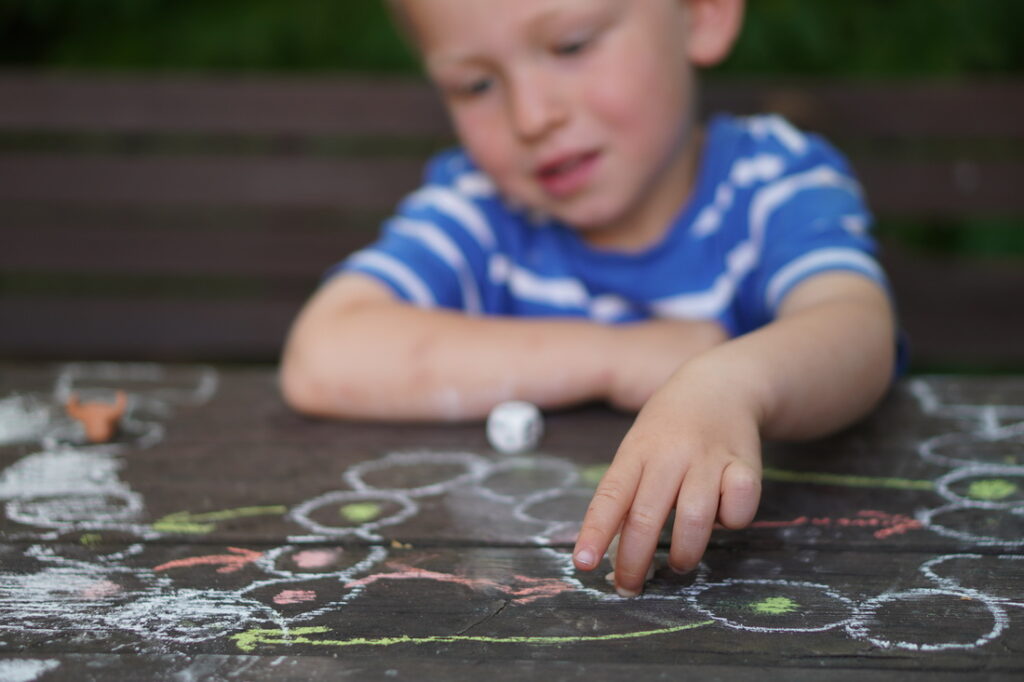 Det trengs bare forskjellige brikker, kritt og et egnet underlag (eller store ark og tusjer)… og så er det masse moro.