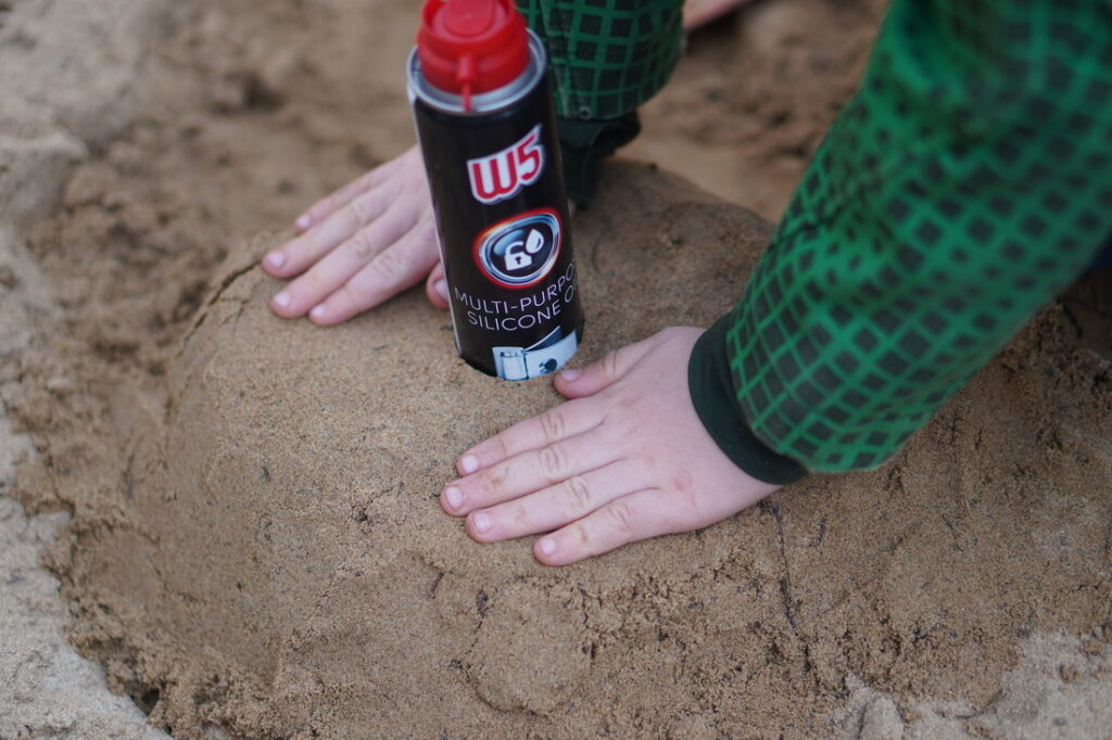 Hvordan lage lys i spennende former på en enkel måte? Dette er en aktivitet som passer perfekt utendørs. Det holder med litt fin sand (sandkasse, strand, en bøtte med sand …).