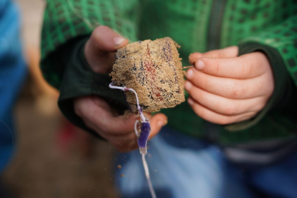 Vi velger en passende gjenstand, trykker den ned i fuktig sand, og i den formen som oppstår fester vi en veke og heller i smeltet voks.